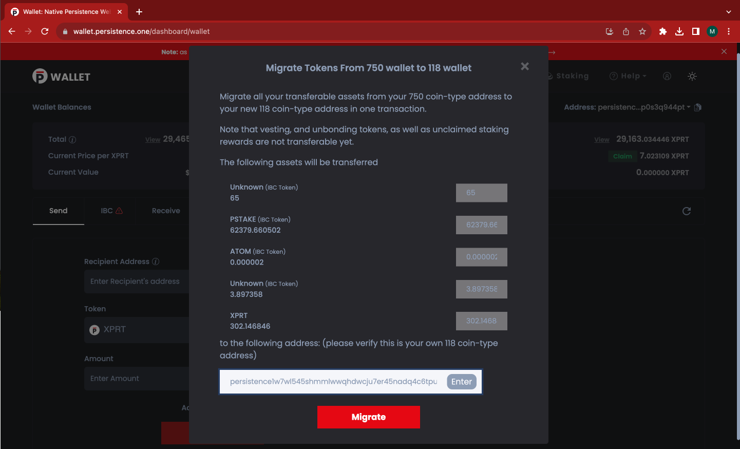 This step will migrate all the available tokens from 750 coin-type address to 118 coin-type address. If you have staked/delegated tokens in your wallet, we'll migrate them in the Step 3.